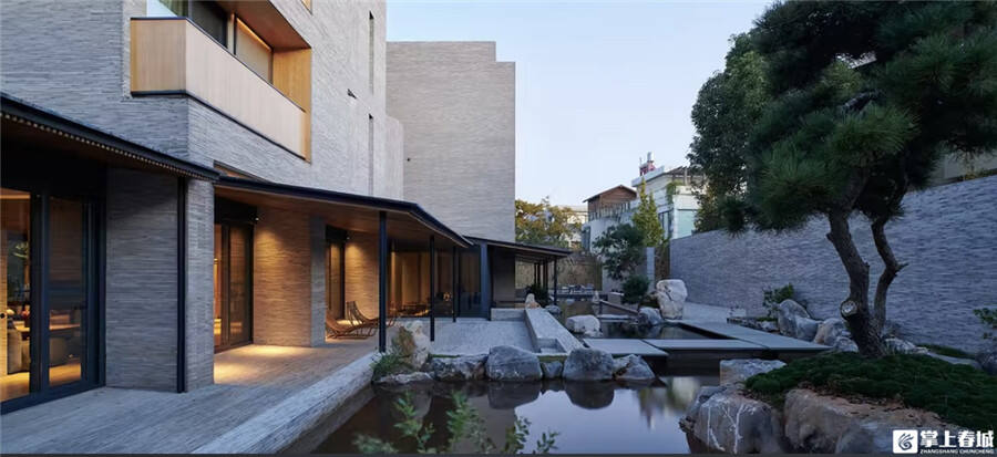 随着市场趋势变化,户外体验不仅是露营椅和帐篷空间的搭建。在泮山居民宿的负责人看来,旅居客们也需要一点悠闲落座,静观隔岸烟火的旅居沉浸式体验。据该负责人介绍,民宿在屋顶设置了四进院庭院,室内的阳光房可欣赏西山270度的景观,敞开式室外露台可欣赏西山美景。“整体风格采用侘寂风格,类似一座小型的石艺博物馆,不只收藏了具有价值的树化玉、大理石等,建筑也使用了不同的石材构筑如金刚砂地坪、清水混凝土条石、火山石等。设计师结合侘寂风将平面的院落‘折叠’为四层的立体空间。”