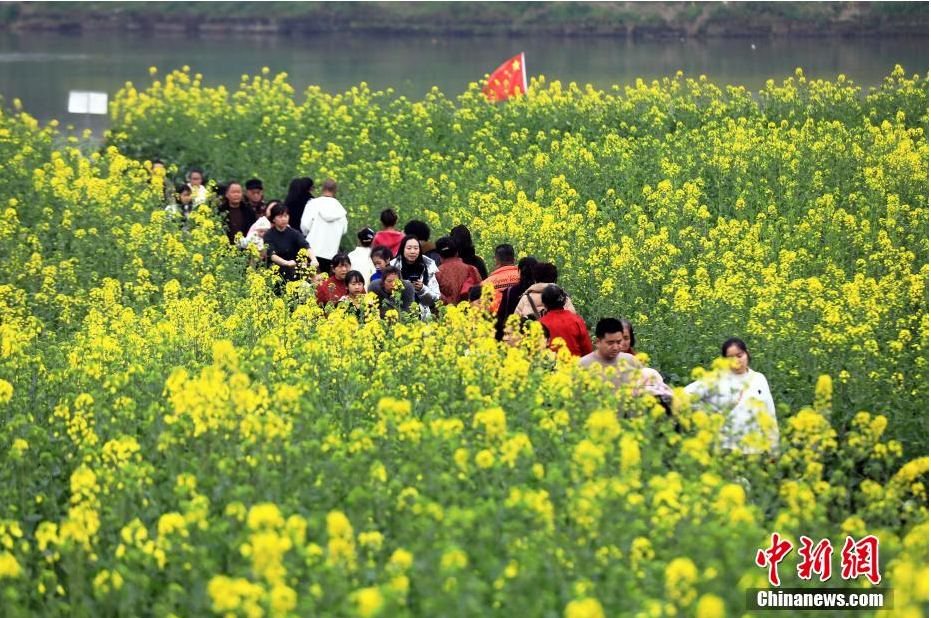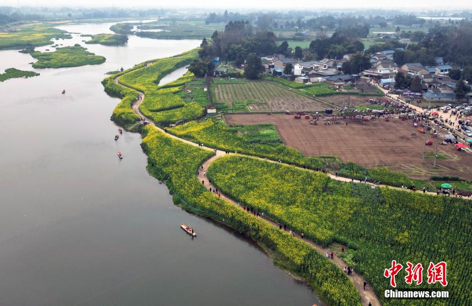 3月2日,四川省邛崃市羊安街道两河口绽放的油菜花,春意浓浓,吸引游人踏青赏花。(无人机照片 中新社 记者王磊 摄)