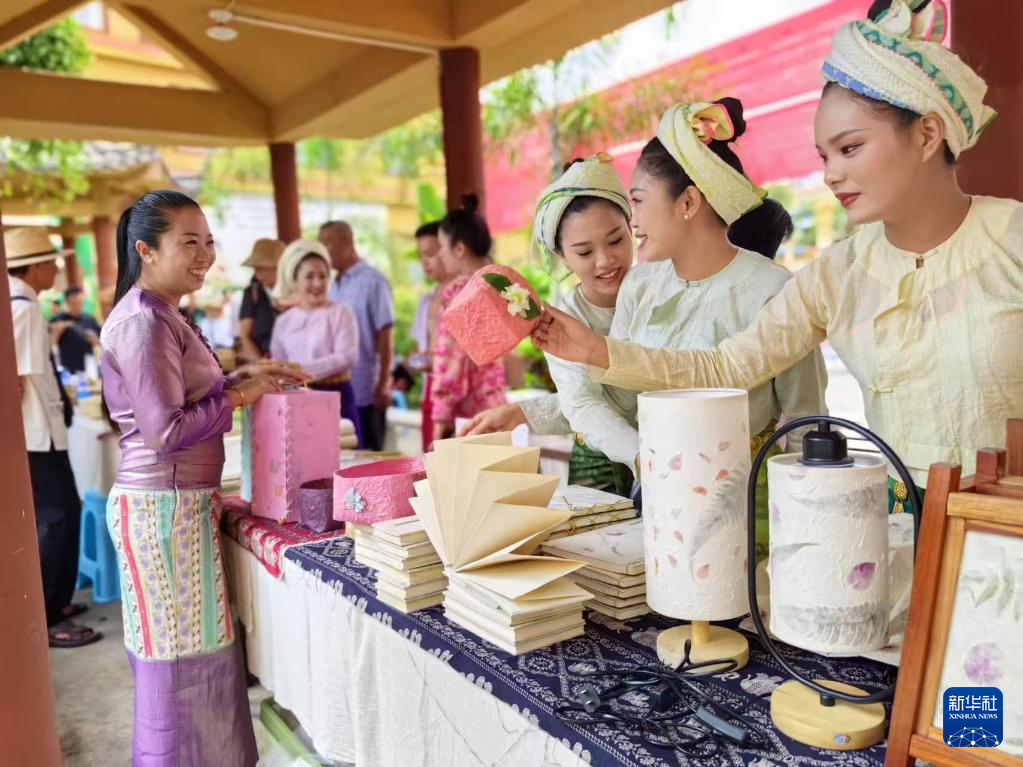 村民们在云南省耿马县芒团村推介白棉纸系列文创产品(资料照片)。新华社发