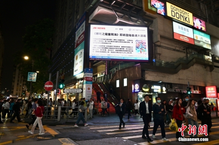 2月18日晚,中国电影史上首部破百亿人民币票房的动画电影《哪吒之魔童闹海》在香港举行首映礼。图为香港铜锣湾一户外屏幕播放动画电影《哪吒之魔童闹海》即将在香港上映的资讯。中新社记者 李志华 摄