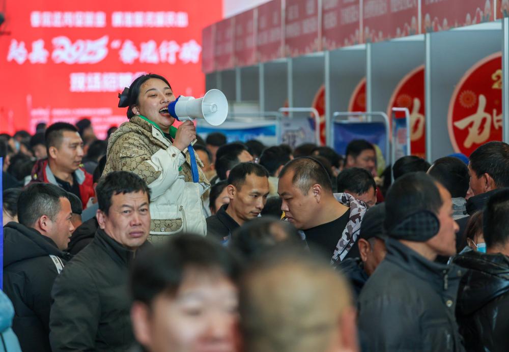 2025年2月14日,在河北省石家庄市赵县城市综合馆举行的“春风行动”现场招聘会上,企业代表宣讲岗位招聘信息。从1月中旬至2月11日,全国已累计举办各类招聘活动2.2万场,发布岗位1500万个。从线下招聘会到网络直播带岗,从重点企业专场到行业特色招聘,各地创新服务方式,助力求职者就业。新华社发(张晓峰 摄)