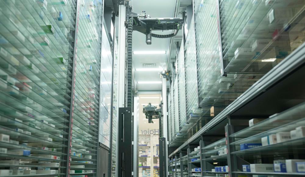 2025年3月5日拍摄的浙江大学医学院附属邵逸夫医院新疆兵团阿拉尔医院智能化药房。该药房从存药、配药、发药到补药等环节实现智能化。快速发药机收到处方指令后,通过机械手精准抓取药品,自动配药、发药、补药,速度最高可达2500盒/小时,还能自动进行整机盘点,实时更新库存。新华社发(王志清 摄)