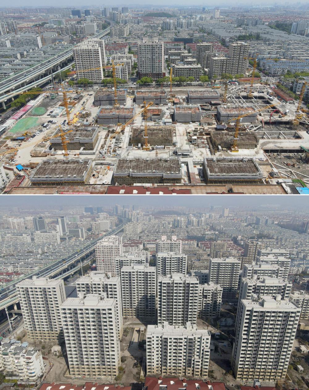 拼版照片:上图为上海静安区彭一小区非成套旧住房改造项目工地(无人机照片,2023年5月25日摄);下图为该项目建成后的景象(无人机照片,2025年2月28日摄)。近年来,上海市大力实施城市更新、老旧小区改造,让“老房子”变成更宜居的“好房子”。新华社记者 方喆 摄