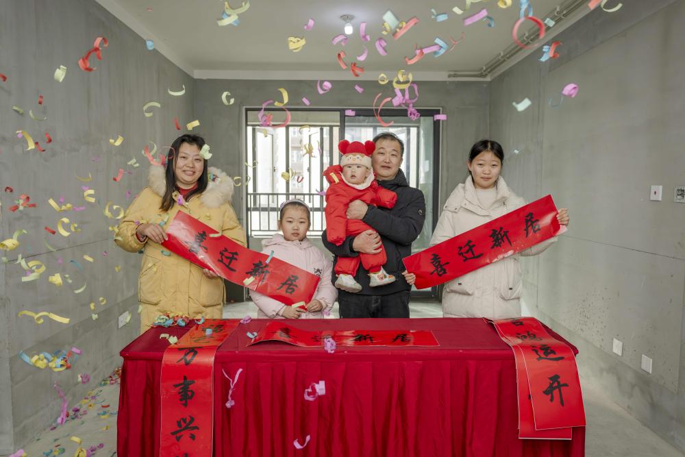 2025年1月1日,一户居民在安徽省合肥市新站高新区磨店和园小区内庆祝新房交付。该小区是安置房项目,配套齐全,共7480户居民受益。新华社发(刘玉才 摄)