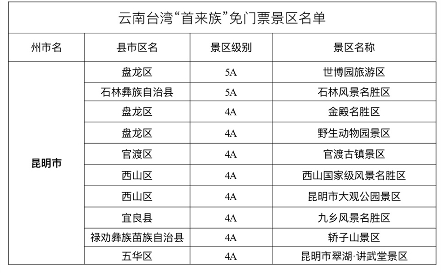 日前记者从云南省人民政府台湾事务办公室了解到,为进一步加大对台湾“首来族”旅客(指第一次从台湾来大陆的台胞)到大陆旅游的优惠力度,深化两岸融合交流,自2025年3月起,对持首次办理台胞证(签发次数为01)的台胞,自签发之日起一年内到云南省有320个旅游景区对台胞免除首道门票费用,其中5A级景区9个,4A级景区124个,3A级景区142个,2A级景区36个,A级景区1个,世界地质公园1个,国家重点文物1个,非A级景区6个。对台湾“首来族”推出减免门票优惠,是云南省扩大深化滇台经贸文化交流合作的创新举措,热忱欢迎更多台湾同胞来美丽的彩云之南旅游、考察、研学、交流,体验“有一种叫云南的生活”。(云南网 记者韩艳慧)