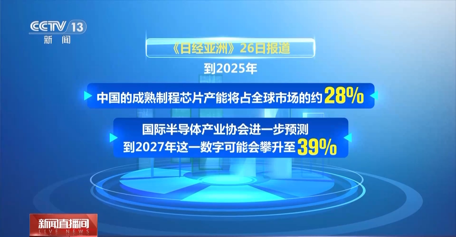 《日经亚洲》26日也报道称,到2025年,中国的成熟制程芯片产能将占全球市场的约28%。国际半导体产业协会进一步预测,到2027年这一数字可能会攀升至39%。