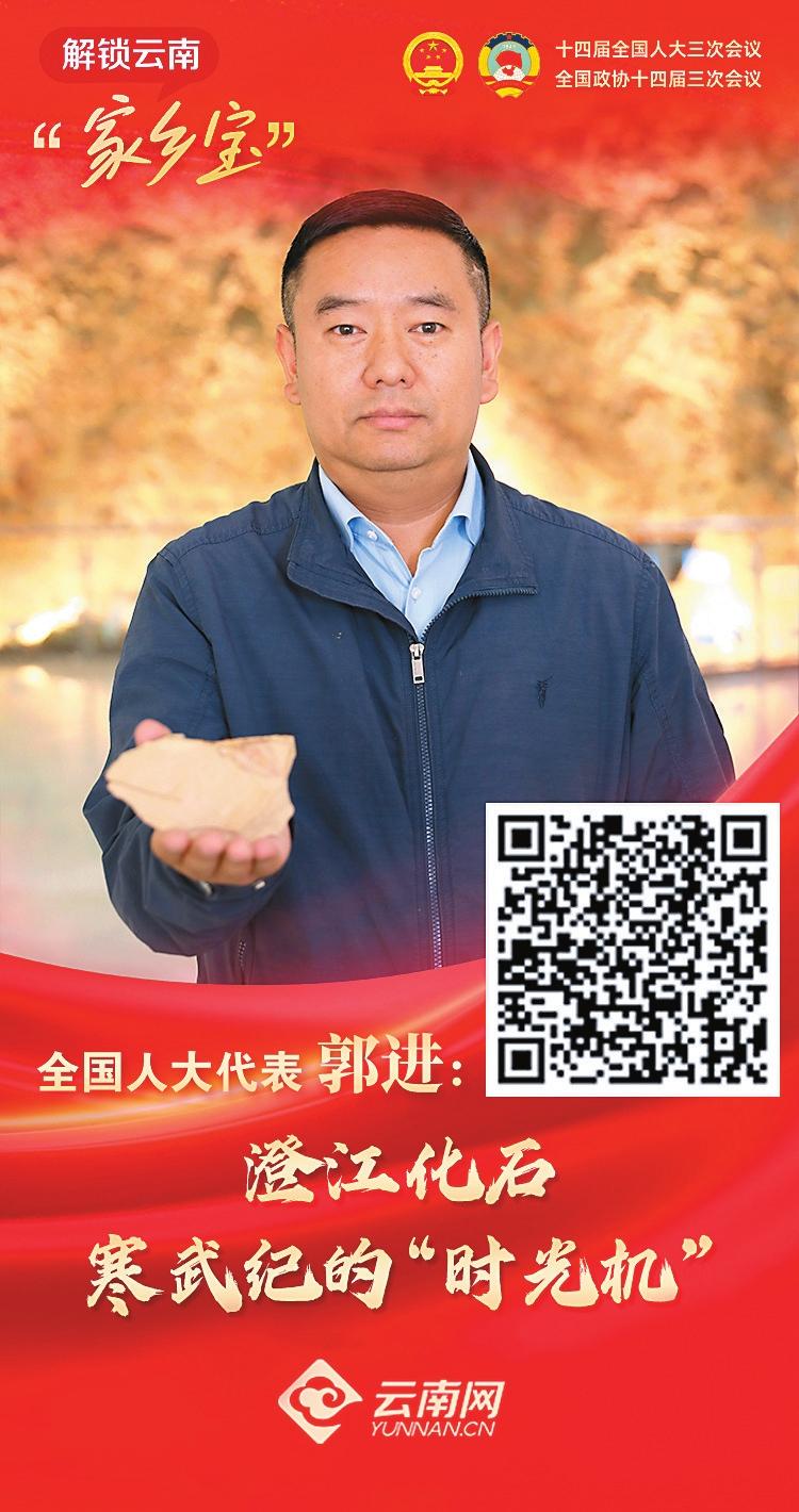 全国人大代表、云南澄江化石地世界自然遗产博物馆副馆长郭进推介澄江化石。这个来自寒武纪的“时光机”,为人们打开了通往5.18亿年前寒武纪生命世界的大门,讲述着地球生命演化的传奇故事。