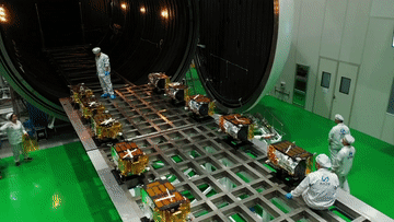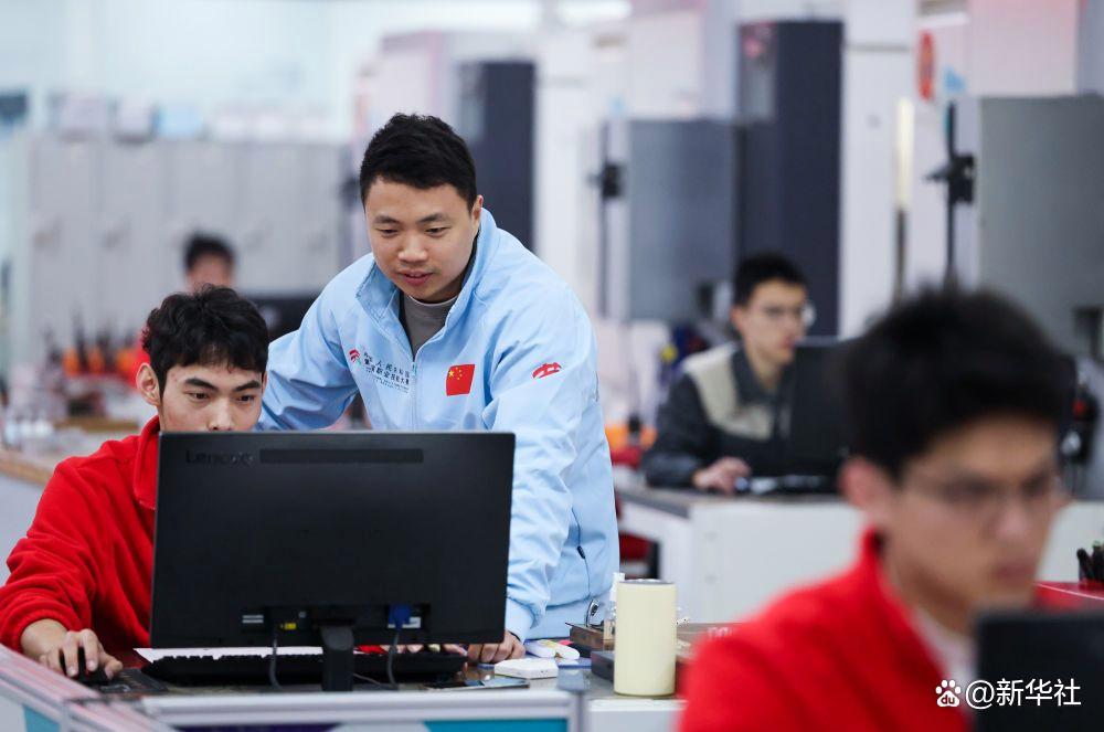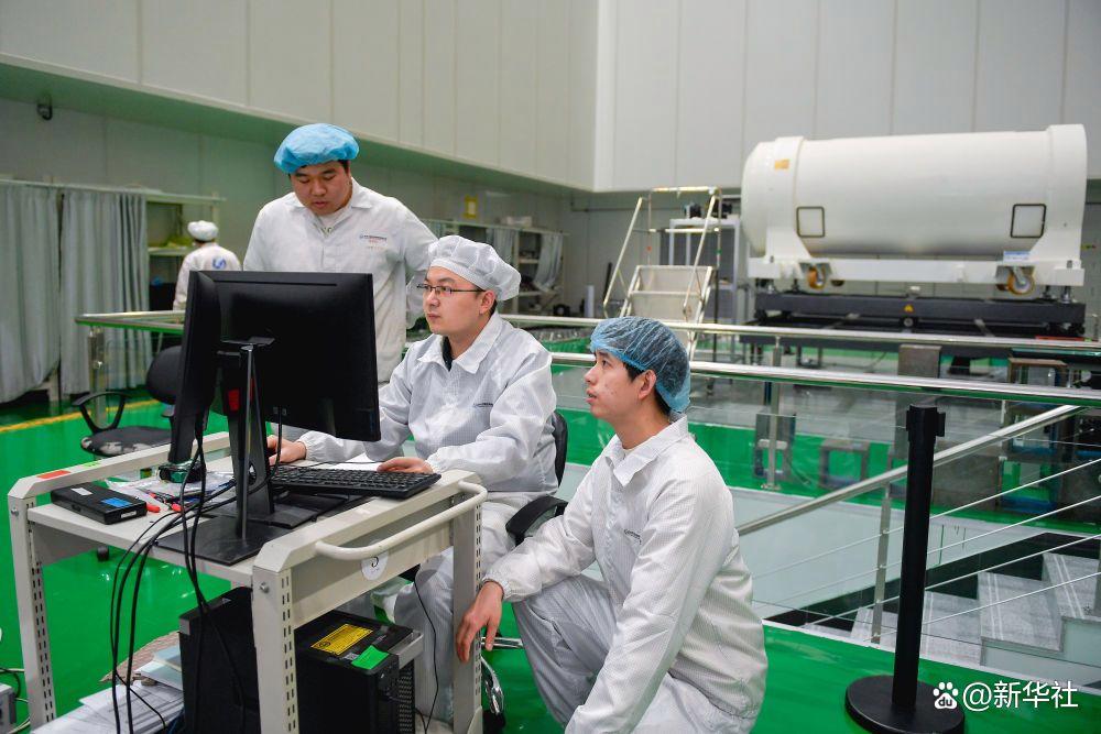 在长光卫星相机装调间,王升(右二)在调试卫星光学遥感载荷组件时与团队成员讨论细节。