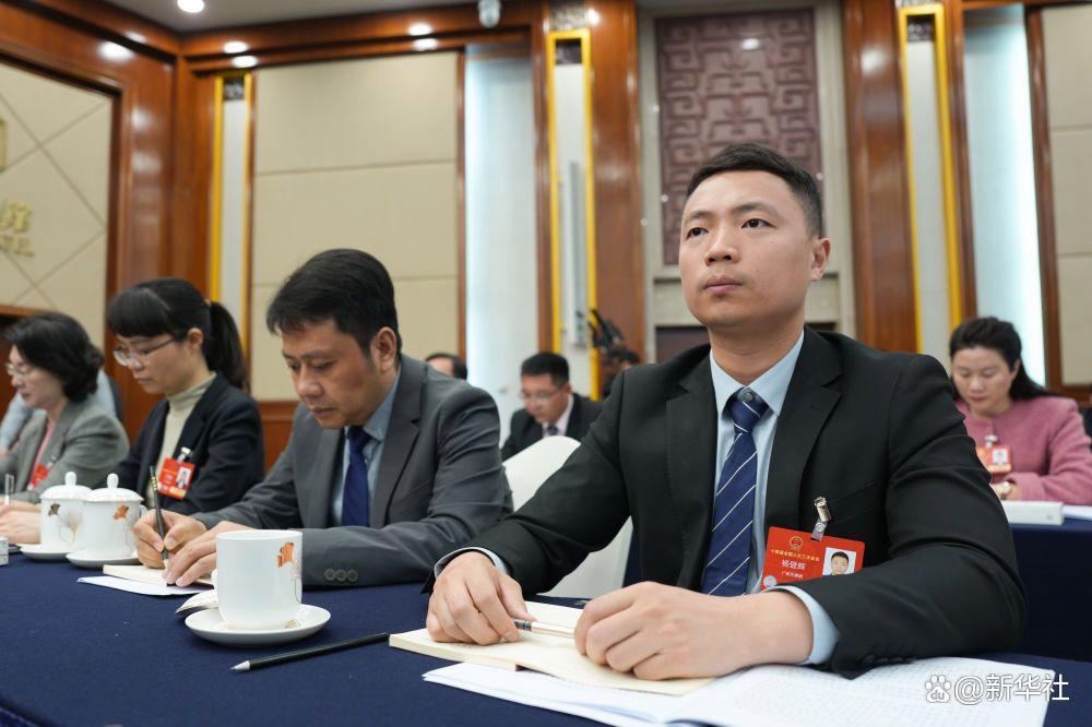杨登辉(前右一)在十四届全国人大三次会议广东代表团全体会议上认真听取发言。