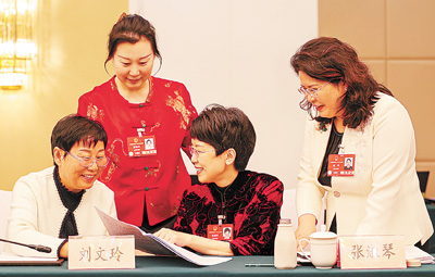 3月7日,十四届全国人大三次会议山东代表团在驻地召开小组会议。图为女代表们在热烈讨论。 |