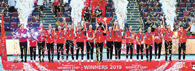 2019年9月29日,日本大阪,2019女排世界杯上,中国女排11连胜夺冠。图为中国女排队员在颁奖仪式上庆祝夺冠。 |