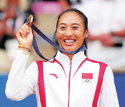郑钦文在巴黎奥运会网球女子单打颁奖仪式上。2024年8月3日,在巴黎奥运会网球项目女单决赛中,中国选手郑钦文成为首个夺得奥运网球单打金牌的亚洲运动员。 |