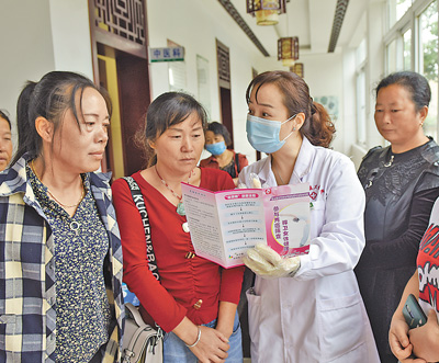 2021年,安徽省马鞍山市含山县昭关镇卫生院医务人员(右二)在给妇女科普“两癌”防治知识。 |