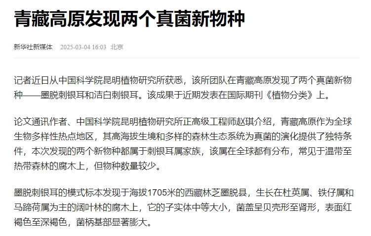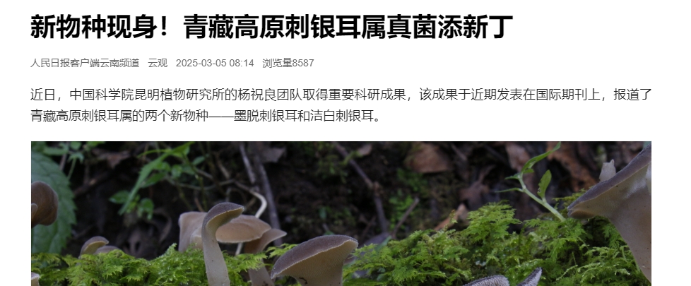 近日,中国科学院昆明植物研究所的杨祝良团队取得重要科研成果,该成果于近期发表在国际期刊上,报道了青藏高原刺银耳属的两个新物种——墨脱刺银耳和洁白刺银耳。