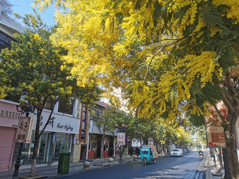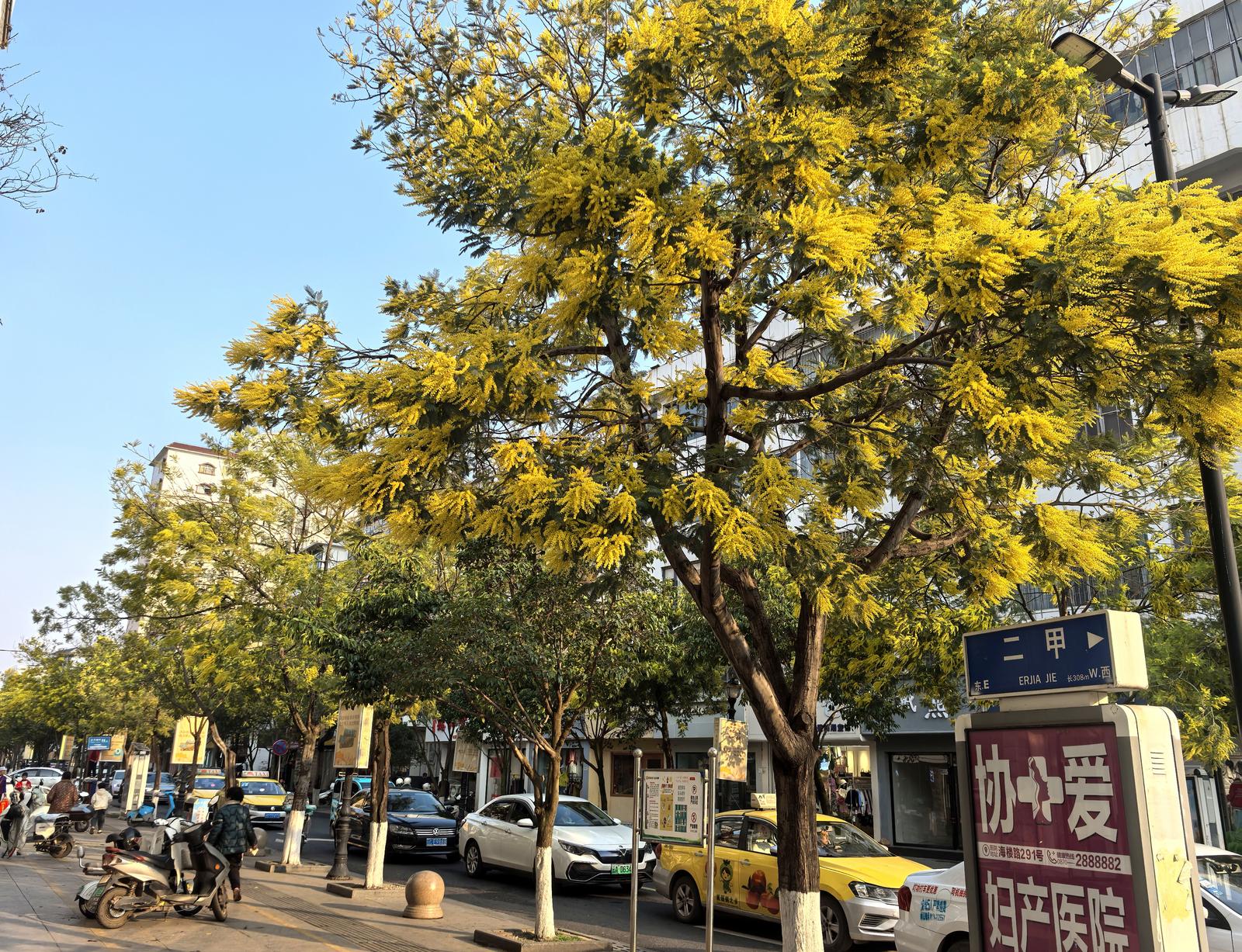 在二甲路路口放眼望去,银荆花一串串、一树树、一片片花开成海,漫步街头,淡雅的花香沁人心脾,抬头看去一簇簇黄色的小花灵动可爱。二甲路小区居民三三两两坐在树下赏春色、拉家常。行人不时驻足拿出手机拍几张照片、发一段视频,记录在二甲路偶遇的春天。在昭阳城区每条街道的春天都不一样,二甲路的春天是灿然、细腻、明艳、治愈的一片柔黄,清甜不腻、浓淡相宜,春风如你,一切刚刚好。
