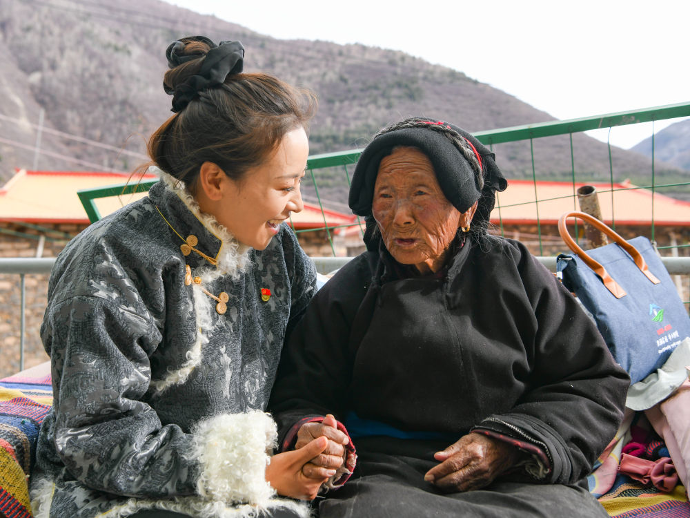 在马尔康市松岗镇松岗村,格西王姆在97岁老人周幺妹的家中了解高龄补贴领取情况(2月18日摄)。新华社记者 王曦 摄