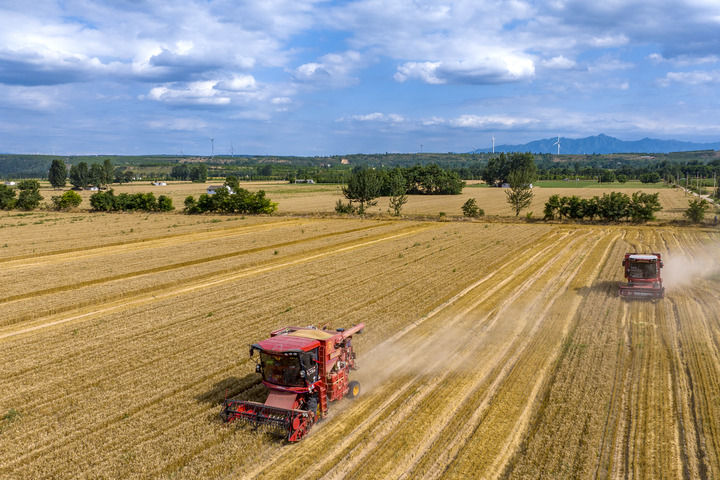2024年6月5日,收割机在河南三门峡灵宝市的麦田里收获小麦。新华社发(杜杰 摄)