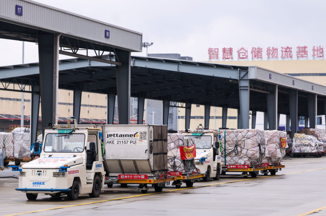 3月13日在杭州萧山国际机场货站拍摄的无人驾驶货物牵引车。