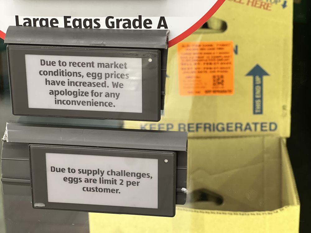 这是2月12日在美国加利福尼亚州洛杉矶县一家连锁店拍摄的鸡蛋限购通知。新华社发(曾慧摄)
