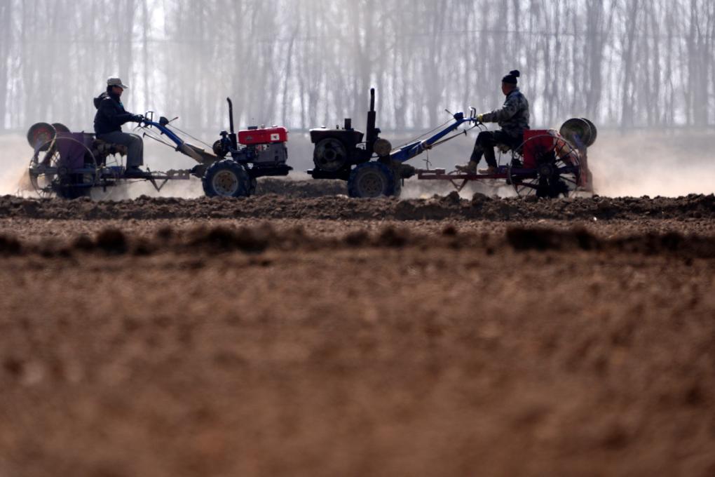 2月18日,在河南省沁阳市崇义镇南里村,农民驾驶农机在田间整地。新华社发(杨帆 摄)