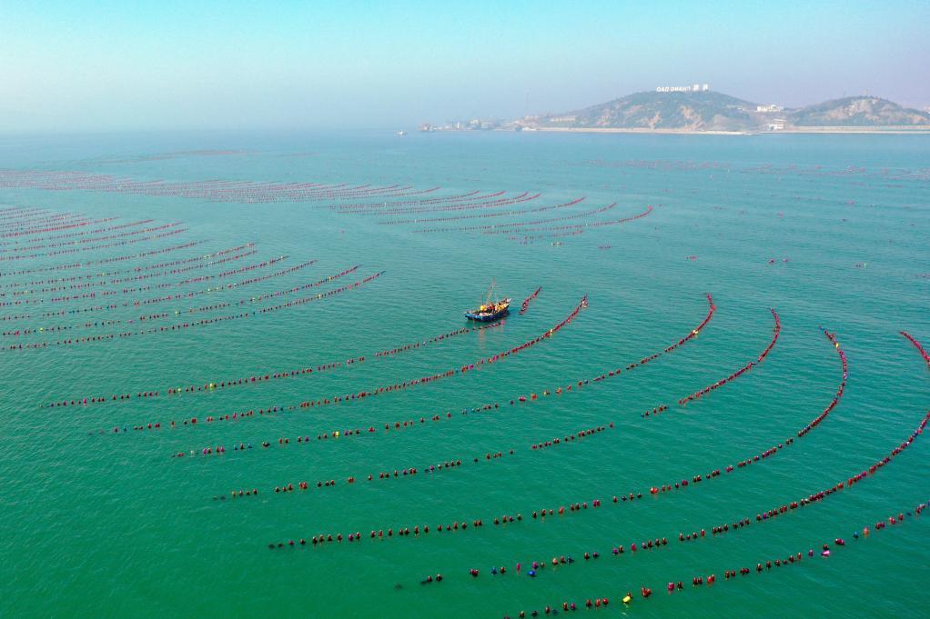 3月12日,养殖工人驾驶船只在山东烟台长岛海域养殖区内生产作业。新华社记者 朱峥 摄