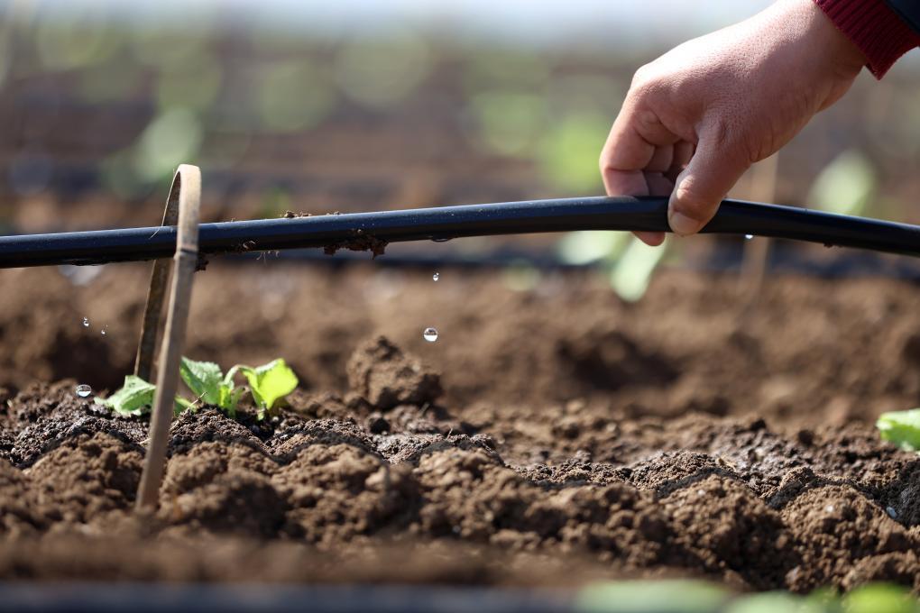 3月13日,在山东省临沂市郯城县郯城街道一处蔬菜种植基地,农民查看滴灌设备精准“补水”情况。新华社发(张春雷 摄)