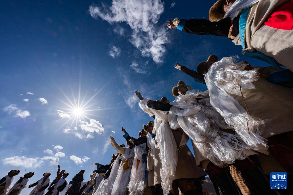 3月16日,西藏拉萨市林周县春堆乡农民在春耕典礼现场播撒青稞种子。新华社记者 晋美多吉 摄