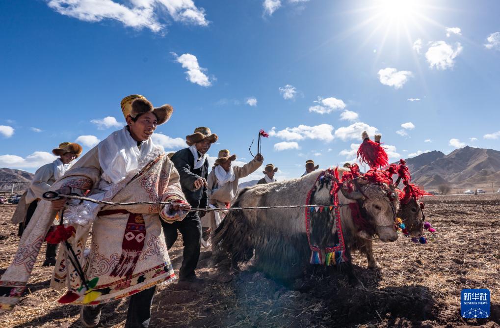 3月16日,在西藏拉萨市林周县春堆乡春耕典礼现场,农民沿袭传统,使用“二牛抬杠”的方式翻土犁地。新华社记者 晋美多吉 摄