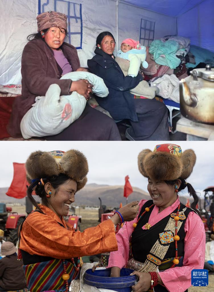 拼版照片:上图为西藏日喀则市定日县发生6.8级地震后,拉孜县曲下镇土林村受灾群众丹珍卓玛(右)和吉拉在临时搭建的救灾帐篷中(1月7日摄);下图为3月16日,拉孜县曲下镇土林村村民丹珍卓玛(左)和吉拉在春耕典礼上检查青稞种子。新华社记者 姜帆 摄