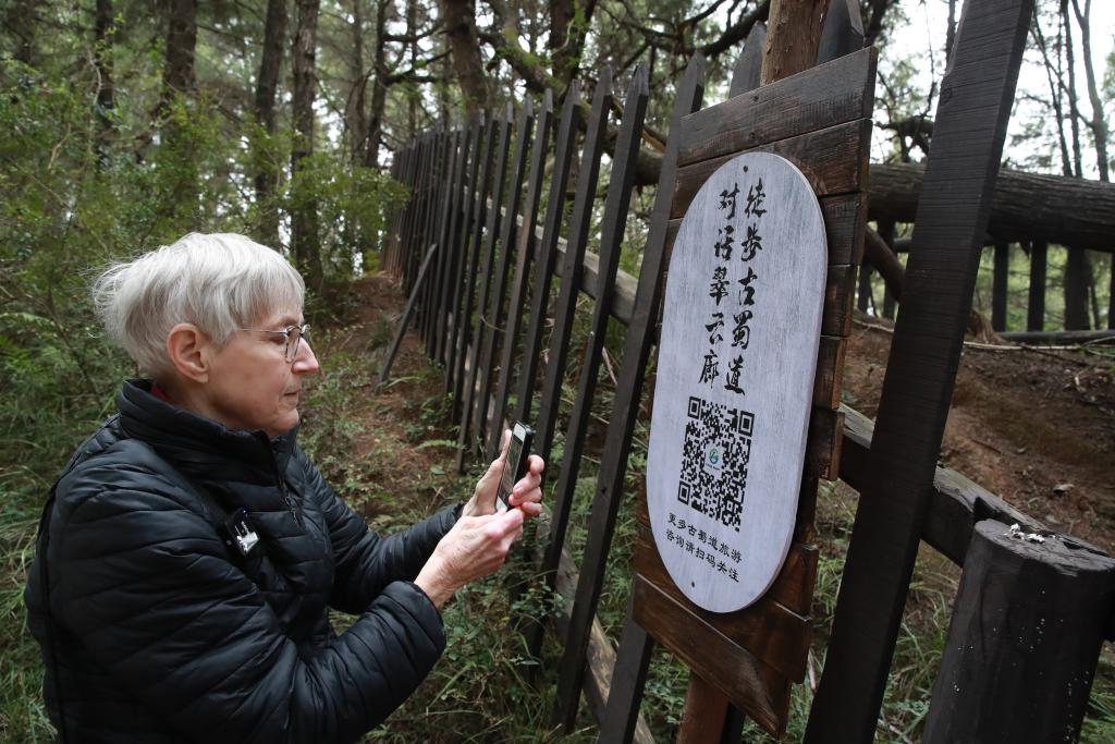 3月15日,贾和普在广元市剑阁县古蜀道用手机扫描铭牌上的二维码。新华社发 刘仁 摄
