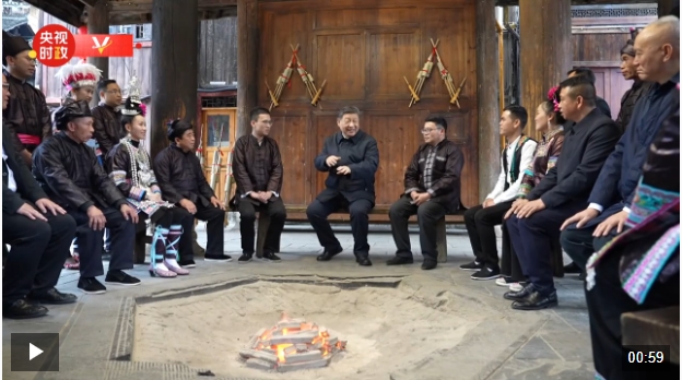17日下午,习近平总书记来到贵州黎平县肇兴侗寨考察。在村寨的信团鼓楼,习近平同村干部和村民代表围坐在火塘边共话乡村全面振兴。大家你一言、我一语,争相向总书记讲述近年来的村寨变化和幸福生活。习近平高兴地说,从你们的讲述、你们的神情可以看出,村寨这些年欣欣向荣。现在旅游是一个很大的产业,乡村旅游如火如荼,民族地区要保留自己的特色文化,在文旅融合中更加彰显它的光彩。祝你们的日子越过越红火!