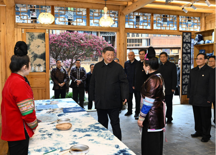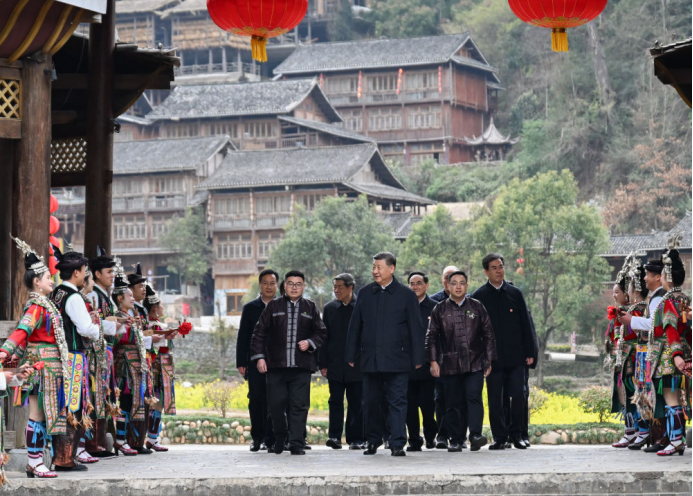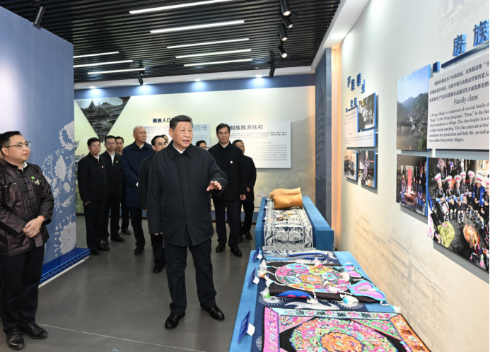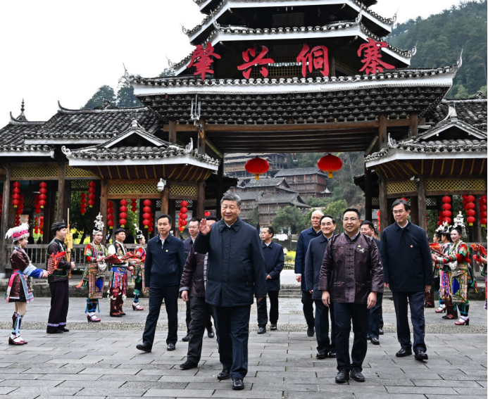 17日下午,习近平总书记来到贵州黎平县肇兴侗寨,观看侗族大歌表演,察看村寨风貌和侗族文化展示中心,深入侗乡织、染、绣特色产业基地,同乡亲们亲切交流。