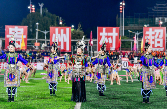2025年3月14日,2025年贵州“村超”40强交叉赛在榕江“村超”足球场举行,演员在比赛间隙表演侗族大歌,民族文化伴随着体育赛事成功“出圈”。