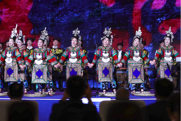 2023年7月9日,演员在2023年生态文明贵阳国际论坛闭幕式上演唱侗族大歌。
