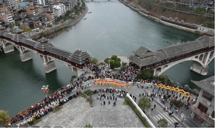 2024年2月22日,在贵州省黔东南苗族侗族自治州锦屏县,舞龙队经过两座风雨桥的交汇处。风雨桥,又称“花桥”,是侗族的标志性建筑之一。因桥上建有廊和亭,既可行人又可遮蔽风雨,故称风雨桥。其以木为料、以榫衔接,是侗族桥梁建筑艺术的结晶。鼓楼、花桥的侗族木构建筑营造技艺被列入国家级非物质文化遗产代表性项目。