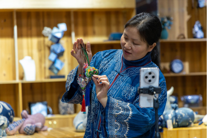 2025年3月14日,村民在肇兴侗寨内通过手机直播销售刺绣作品。侗绣承载着侗族人的信仰与记忆,年轻绣娘的手艺多半来自母亲传承,侗族妇女用一针一线将民族古老的神话传说、历史风俗记录在服饰的纹样里,让这门手艺在侗乡世代传承。2011年,侗族刺绣被列入国家级非物质文化遗产名录。