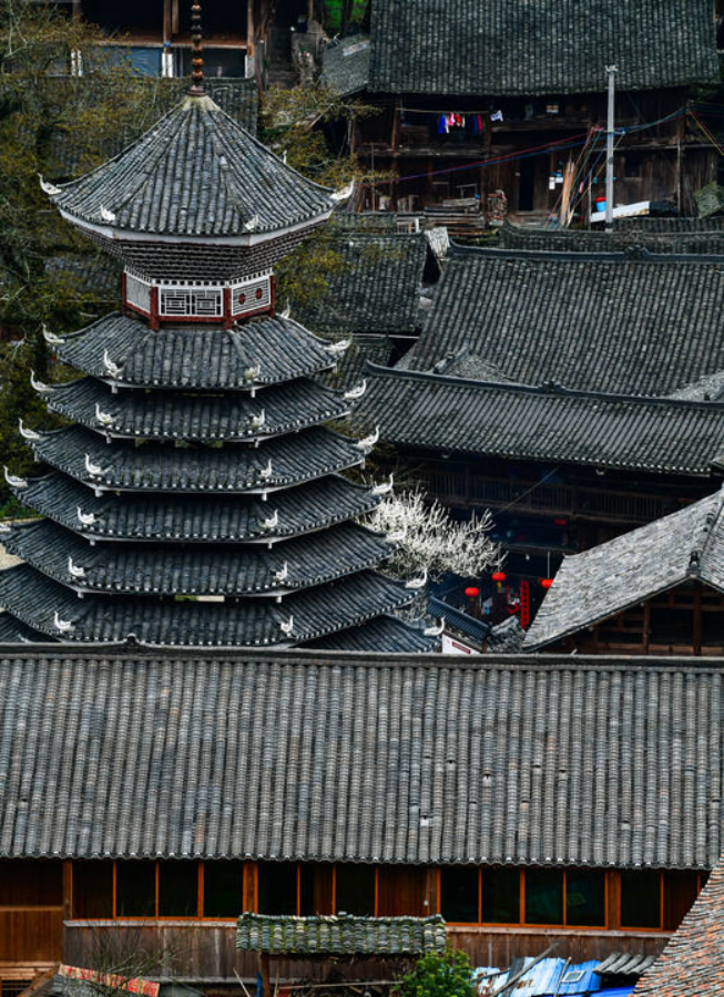 2024年3月17日拍摄的贵州省榕江县栽麻镇大利侗寨鼓楼。鼓楼是侗族的文化符号之一,每个侗寨至少有一座,是侗族人民集中议事、评断是非的公共场所,也是侗家人出生和去世时必须要停留的场地。