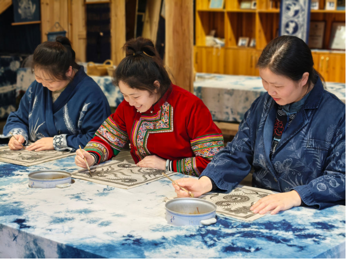 2025年3月14日,村民在肇兴侗寨内制作蜡染。近年来,当地加大对少数民族非遗文创产品的研发和创新力度,同时进一步加强线上销售,通过微信、网上直播、网店等方式进行带货,让当地群众通过指尖增收致富。