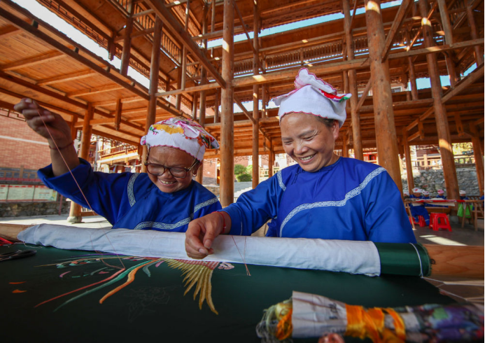 2021年9月27日,贵州省镇远县报京乡报京村村民邰木香(右)在制作侗绣。邰木香将侗族的民间故事以刺绣形式展现出来,还先后开发出传统与现代相结合的侗族服饰、工艺包、绣花鞋、围腰、头巾、枕巾等系列产品,深受国内外客商的青睐,致富的同时带动当地300多名绣娘实现就业增收。