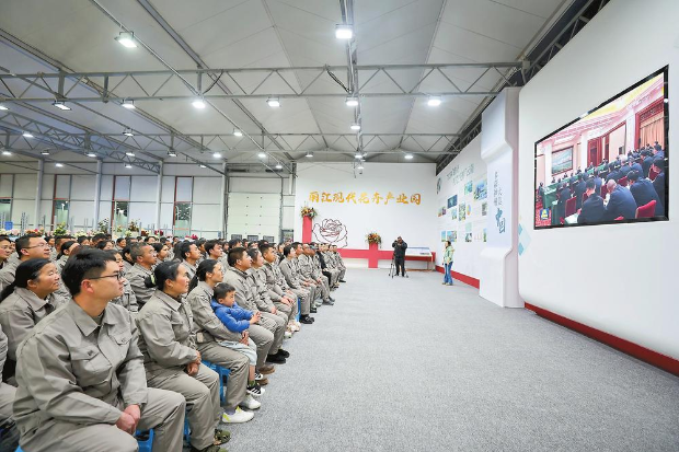 3月20日,丽江现代花卉产业园区员工集中观看习近平总书记在云南考察的新闻报道。记者 胡妤雅/摄