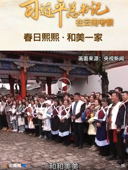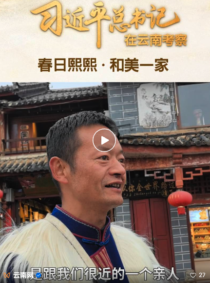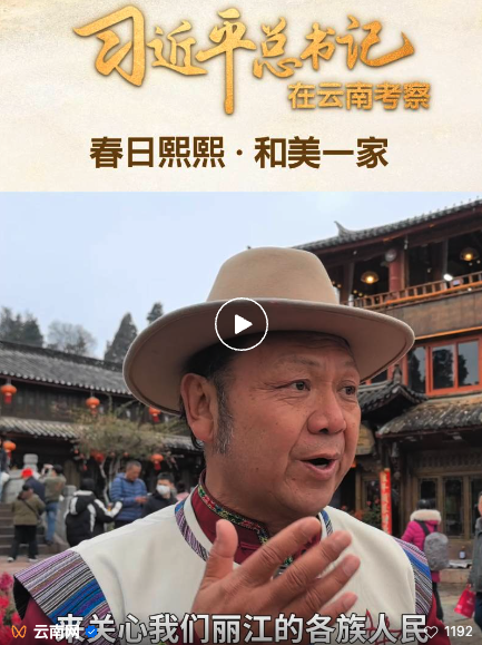 丽江市玉龙县民族文化工作队队长杨泽民与众多居民、游客一同载歌载舞欢迎总书记
