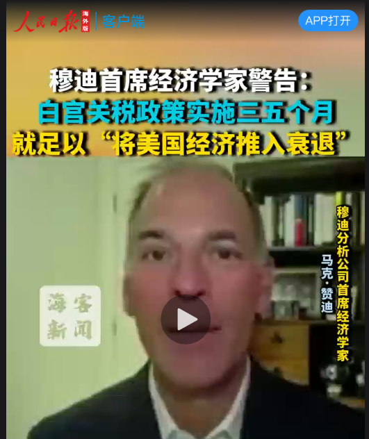 穆迪首席经济学家马克·赞迪19日在CNN节目上警告,白宫当前的关税政策若持续实施三五个月就足以“将美国经济推入衰退”。
