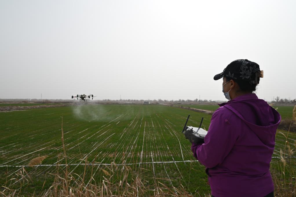3月18日,在新疆喀什地区英吉沙县一麦田,努日曼古丽正在操作无人机。新华社记者 尹茹红 摄
