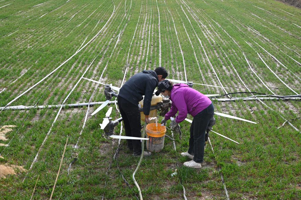 3月18日,在新疆喀什地区英吉沙县一麦田,努日曼古丽和丈夫在为无人机添加农药。新华社记者 尹茹红 摄