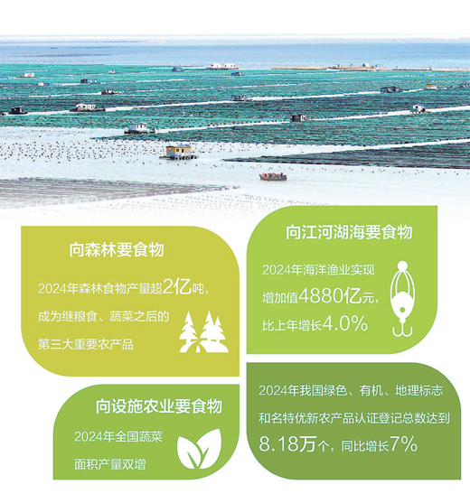 向森林要食物,2024年森林食物产量超2亿吨,成为继粮食、蔬菜之后的第三大重要农产品。向江河湖海要食物,2024年海洋渔业实现增加值4880亿元,比上年增长4.0%。向设施农业要食物,2024年全国蔬菜面积产量双增。