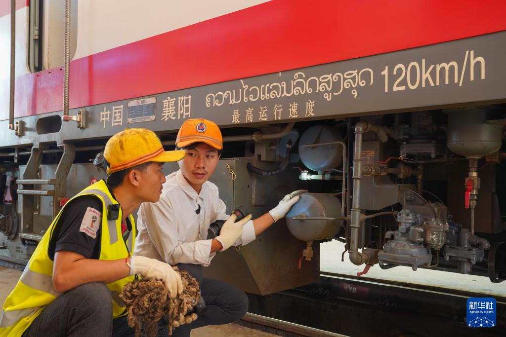 2024年12月1日,在中老铁路老挝琅勃拉邦站,阿体阳(左)与中国师傅张志雄确认行车径路。新华社发(周星摄)
