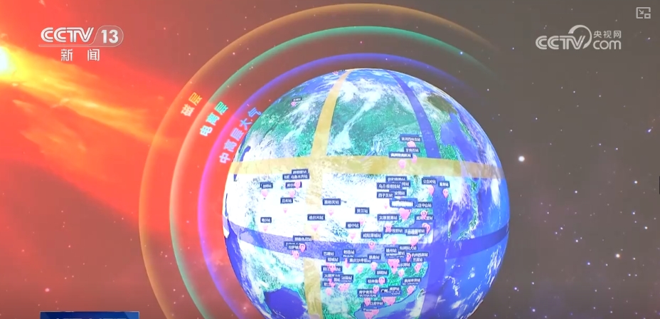 为了全方位监测太阳的一举一动,中国科学院空间中心的科学家们是花了10多年的时间,在地球上是沿着东经120度、北纬30度、东经100度、北纬40度这样两纵两横很明显的一个“井”字形,布局了31个台站近300台设备,是首次实现了对日地空间环境全圈层多要素的这样一个立体式综合式探测。应该说,这是中国覆盖面积最广的一个国家重大科技基础设施,也是中国地图上守护地球最牛的一个“井”字。