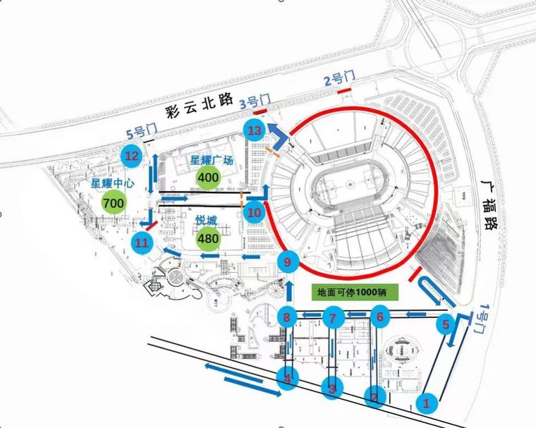 观众车辆可由彩云北路5号门和广福路1号进入,经内部道路行至星耀广场地下停车场、星都总部基地停车场、悦城国际停车场停放。