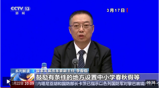 国家发展改革委副主任 李春临:大家反映突出的“加班文化盛行”等痛点问题,《方案》专门就“保障休息休假权益”提出了相关举措,通过强化执行监督来落实带薪年休假制度,明确不得违法延长劳动者工作时间,同时鼓励弹性错峰休假,鼓励有条件的地方设置中小学春秋假等。相信随着《方案》的落实落地,我国消费市场能有更强劲的增长势头、更优质的消费供给,也能给大家的生活带来更多的提升和便利。