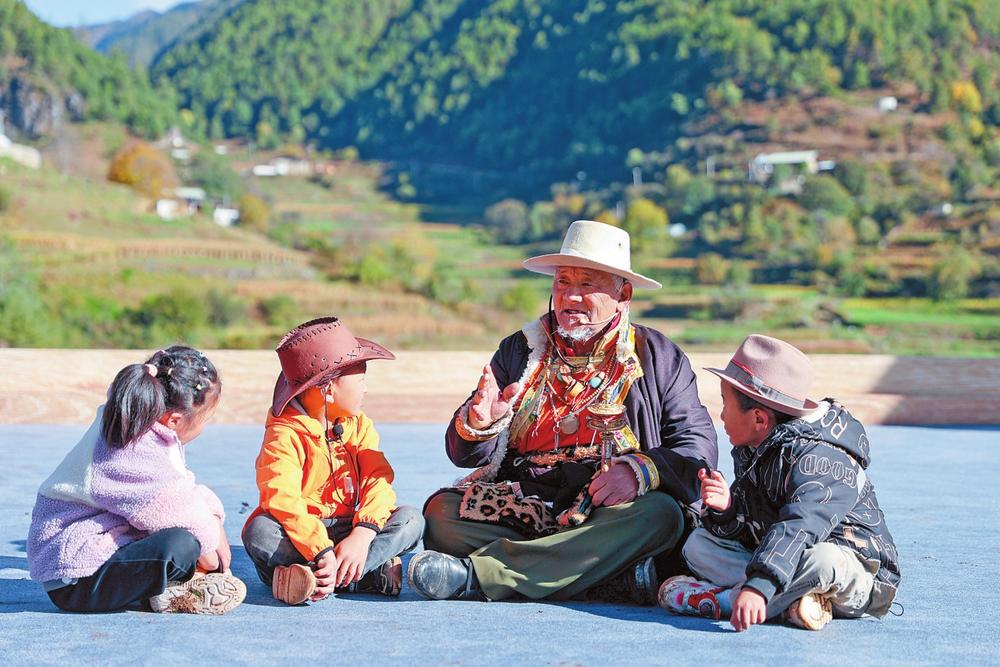 在香格里拉尼汝村,藏族爷爷给儿童讲民族团结的故事。记者胡妤雅 摄
